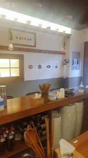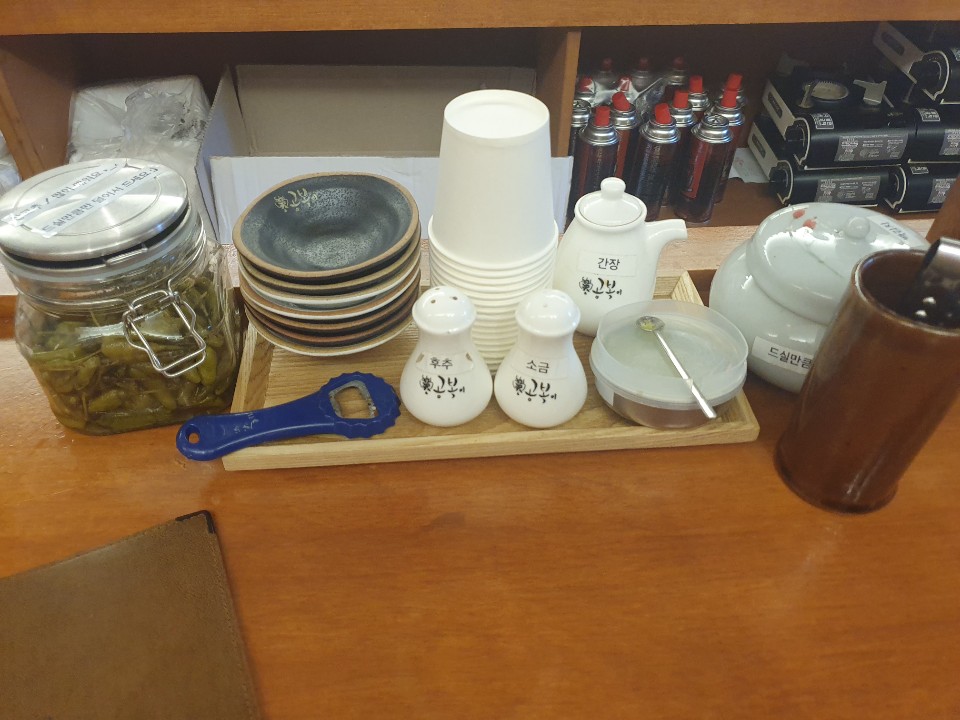 자리 앞에는 밑반찬 그릇 후추 소금등